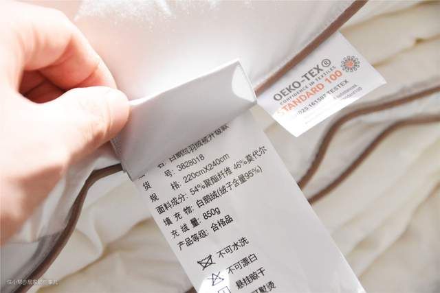 无论是羽绒服还是羽绒被拿到手后率先要看的就是标签和挂牌,在标签上印有Oeko-Tex Standard 100的字样,查了相关资料,这个意思就是通过世界十五个国家的知名纺织机构鉴定和测试,通过了生态安全保证,用大白话来讲就可以放心的盖。在耗氧量方面每100克的耗氧量只有3.2mg,这说明了被子内羽绒中微生物的含量非常低,长期使用不会出现皮肤问题,这项标准通过了日本的严苛要求,日本人对贴身物品的要求是出了名的严苛。