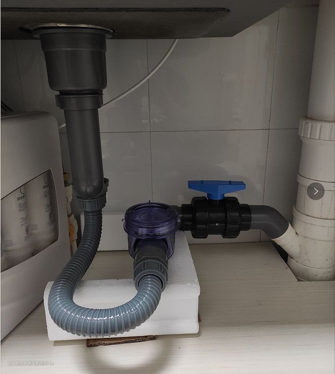 3.按照安装图纸或者是安装视频把止回阀套装先不涂胶水拼接一遍,拐弯版的先装球阀再装止回阀,管子是45度出来的就把一个弯头换成45度的。拼接好的哈蒙德止回阀套装拿去下水处比对一下,看一下安装空间够不够,合不合适。下水落差低要用防溢水接头和软管做全封闭排水。