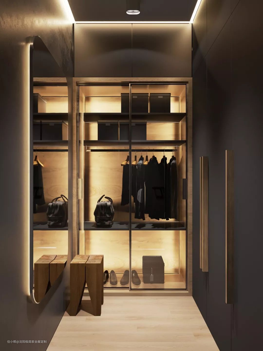 隐藏于玄关柜中的衣帽间,墙面上贴着一块全身镜,壁橱的灯带非常的实用,同时也十分的美观。