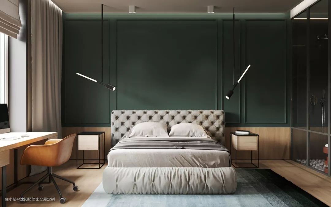 干净利落的线条让房间看起来十分的简洁,墨绿色的背景墙配上灰色的床品营造了舒适的睡眠空间。