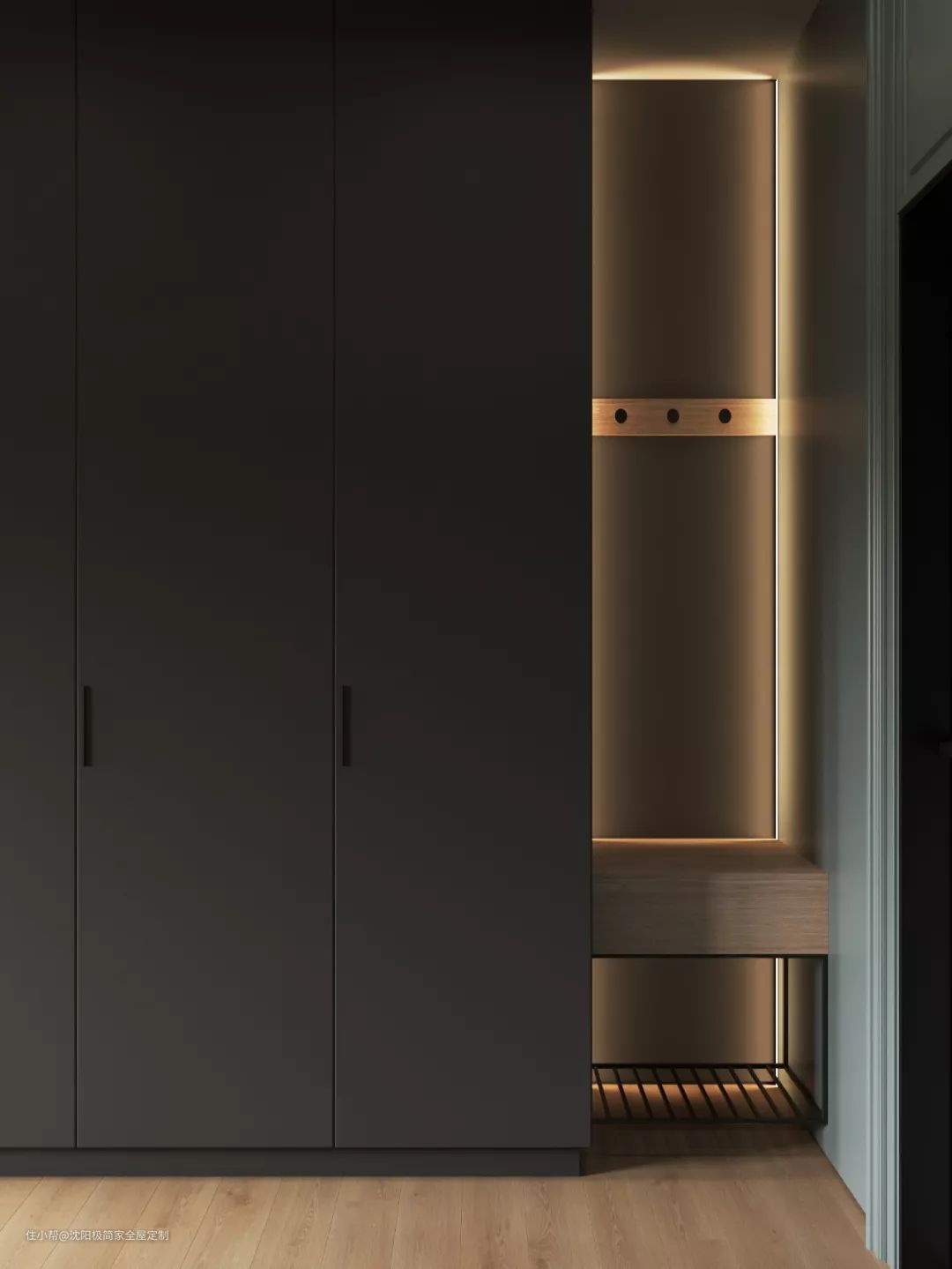 右侧是一个镂空鞋架,内侧安装了灯带,非常的有质感,另一边紧紧连着灰色的落地衣柜。