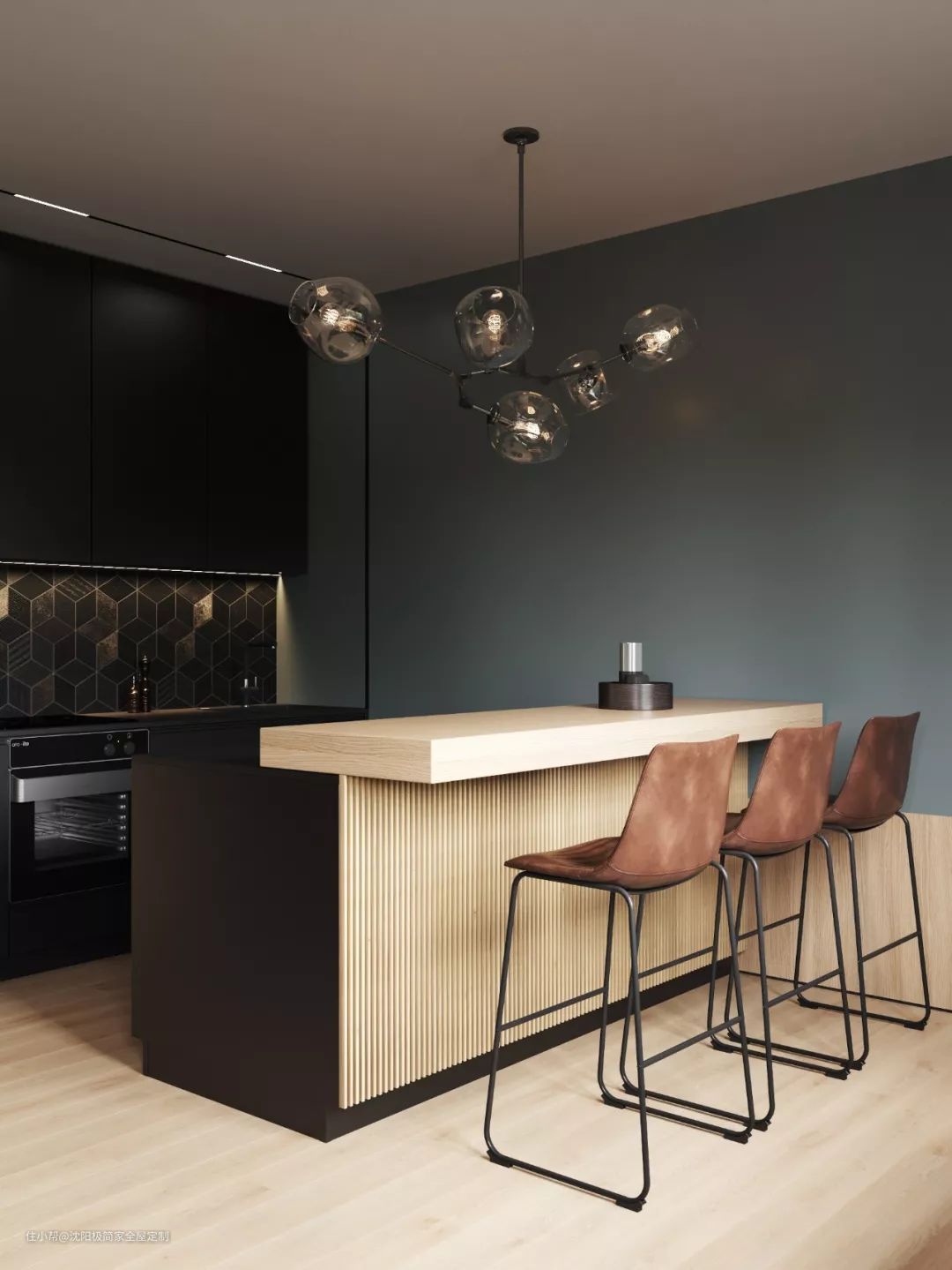 厨房墙面上的几何花纹、黑色的壁柜,尽显高级感,吧台的设计独到,家里来了朋友在上面喝酒聊天非常有氛围。