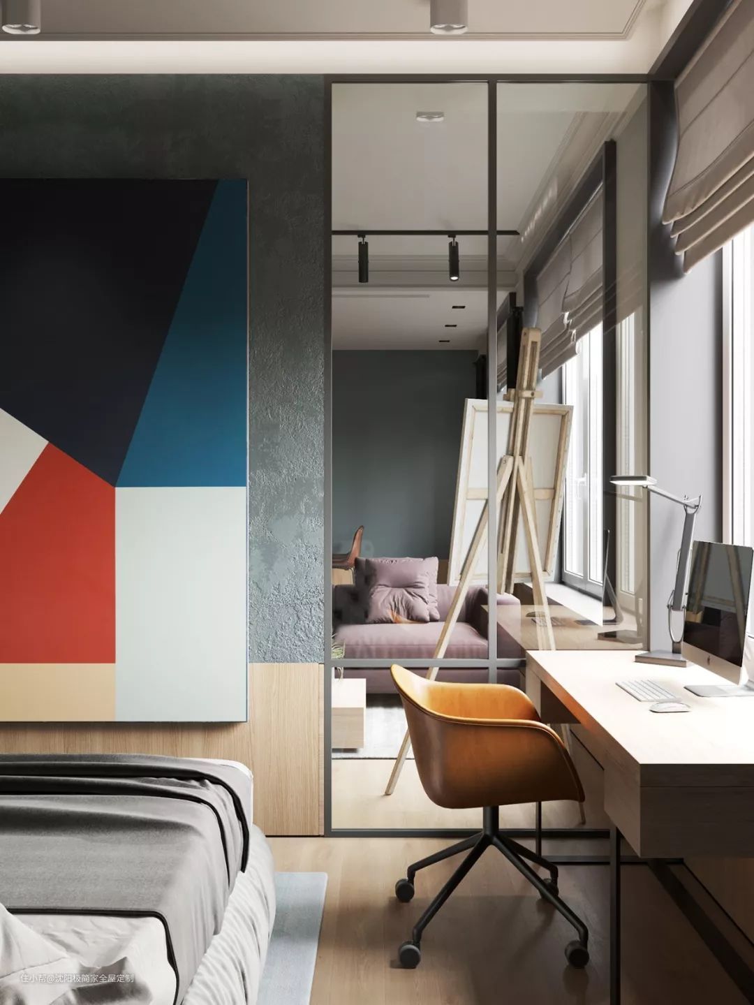 主卧就在电视机背后,窗前放置了一张桌子,一个小小的办公区域应然而生。