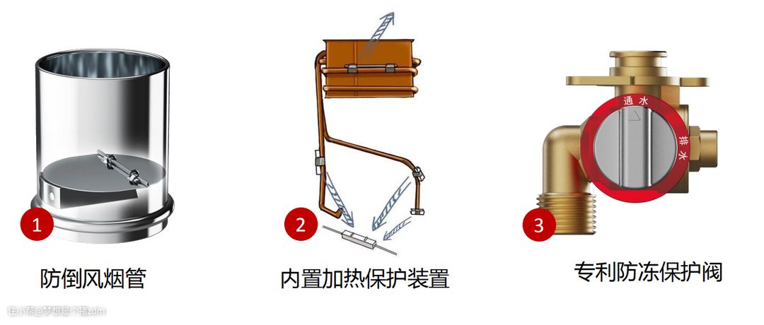 要实现防冻保护,首先需要设计防倒风烟管,然后需要内置加热保护装置,这是目前大多数燃气热水器常用的一些方式,而如果要实现更好的防冻保护,则需要加装防冻保护阀,安装有防冻保护阀的情况下,即便热水器断电后,也能通过简单的排水操作,实现可靠的防冻。