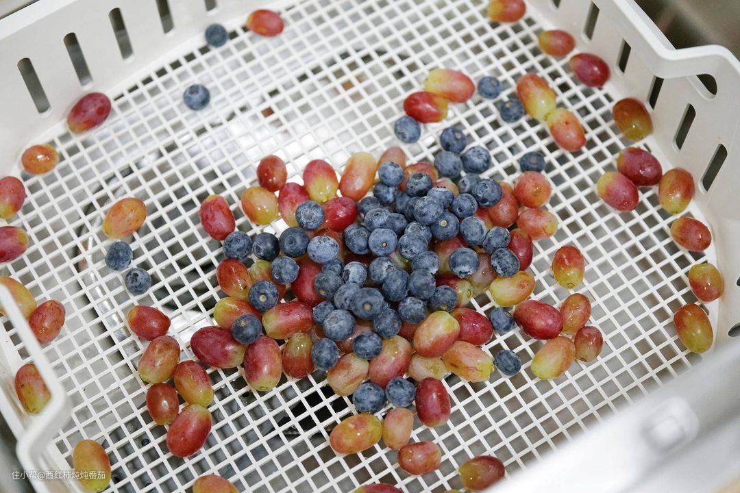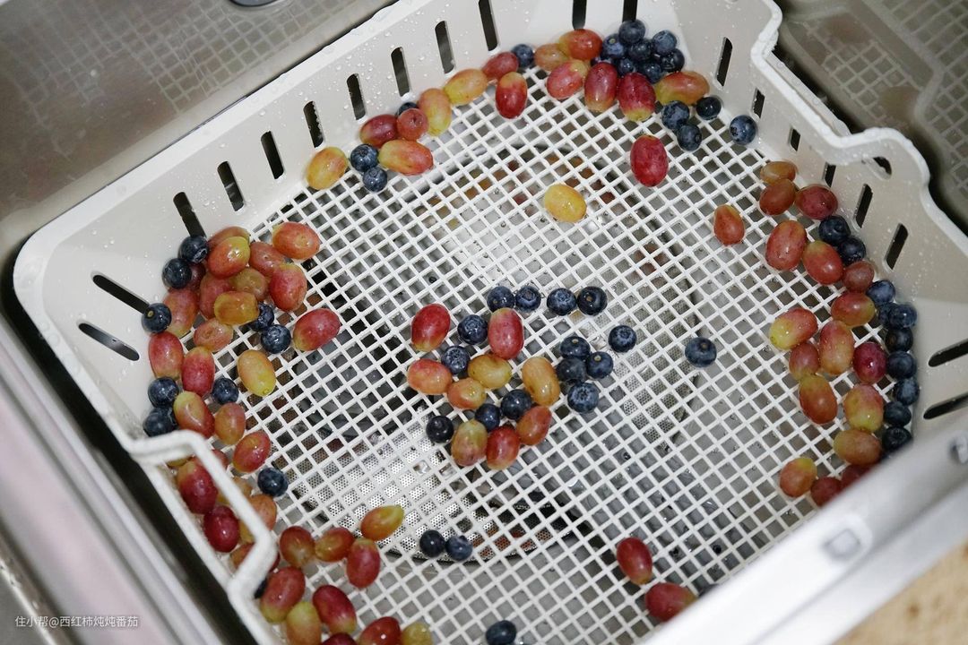 洗碗机内部碗篮换成塑料篮,然后把提子和蓝莓一起倒进去 ▲