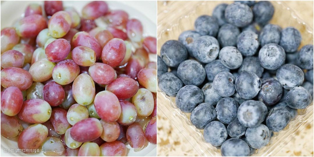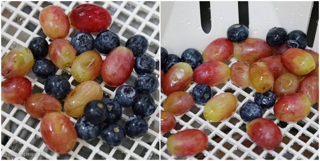 不过这里要特别说明一下,蓝莓表面的白色粉状物和提子/葡萄表面的并不相同:蓝莓表面的是果霜,可以食用。并且几乎无法完全洗净。楼主这里也只是为了方便,所以把它跟提子丢到一起洗了一遍。