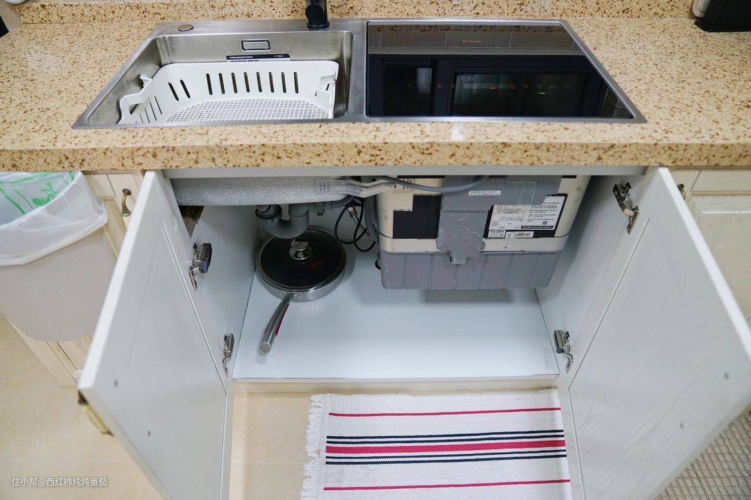 先看一眼安装好机器之后的厨下柜整体的样子。左边水槽部分和普通台盆差别不大,可以正常储物;右侧基本被洗碗机占满,楼主也不建议继续在下面存放东西 ▲