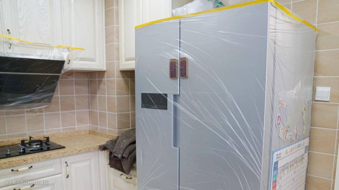 因为改造涉及台面的切割,会产生大量的粉尘,所以楼主提前把厨房收拾得干干净净。至于冰箱、烟灶这些没办法收拾的电器,小哥给楼主包上了一层塑料膜防护,也算比较贴心的细节 ▲