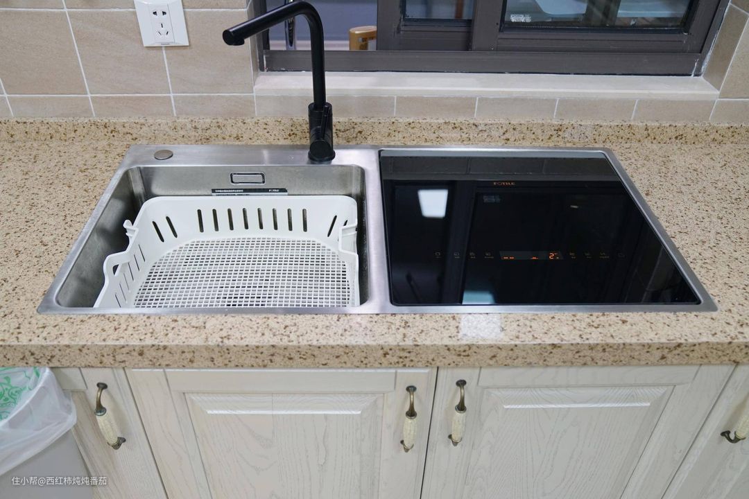 这一点算是意外之喜,是楼主之前没有想到的。新装的E5的水槽,宽度比原先多了整整 6cm,用起来比之前爽了很多,再配合可拉伸的大白水龙头,完全不用担心水滴飞溅。