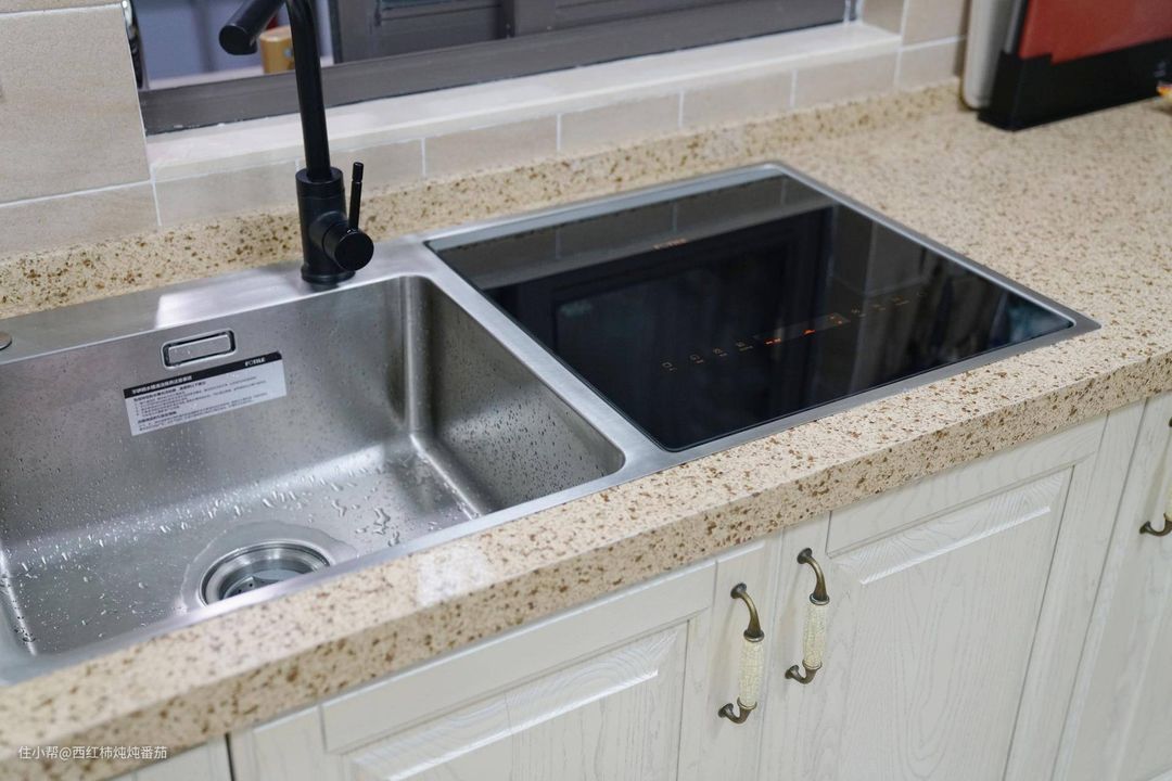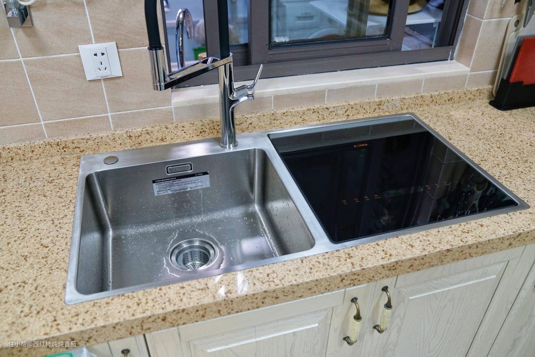 水槽很大,这也算是意外之喜,洗东西简直酣畅淋漓,据安装师傅说方太还有单槽的产品,只有一个洗碗槽,喜欢用双水槽的可以买这种搭配。另外,洗碗机原装没有附带水龙头,但是买洗碗机送了一个摩恩,楼主建议大家自行配一个抽拉龙头(提前准备,后期换装空间有限,操作麻烦),用起来更加畅爽!