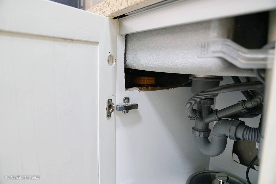 1、橘红色的水管和白色的排水管影响了台面深度要求;2、角阀(上图中被下水组件挡住)过长,影响了橱柜内壁深度。