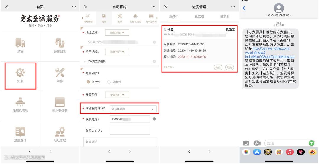 预约方式非常简单:第一步就是扫描外包装上的二维码,关注名为“方太服务”的公众号,在导航栏中间“至诚服务-自助预约”栏按部就班填写信息,然后提交就可以了;完成预约后,可以在公众号查询预约进度;并且在官方进行派单后,我们还会受到短信确认 ▲