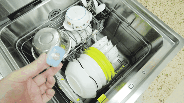 摆完所有碗碟之后,随手丢入一颗三合一的洗碗块 ▲