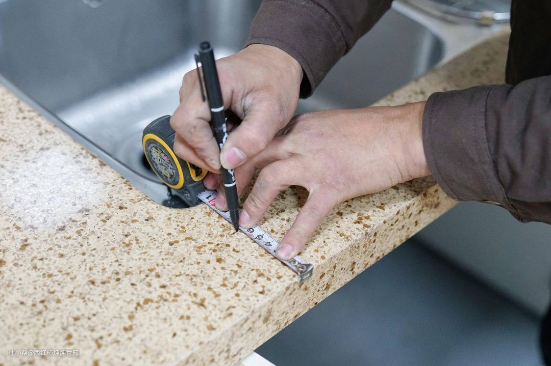 台面切割过程是小哥在厨房封闭操作的,楼主也没有跟着观察。等小哥喊楼主可以安装的时候,台面已经收拾得干干净净了。因为这款方太E5长度要比楼主原来的水槽更长,所以在切割时还占用了一部分左侧下橱柜 ▲