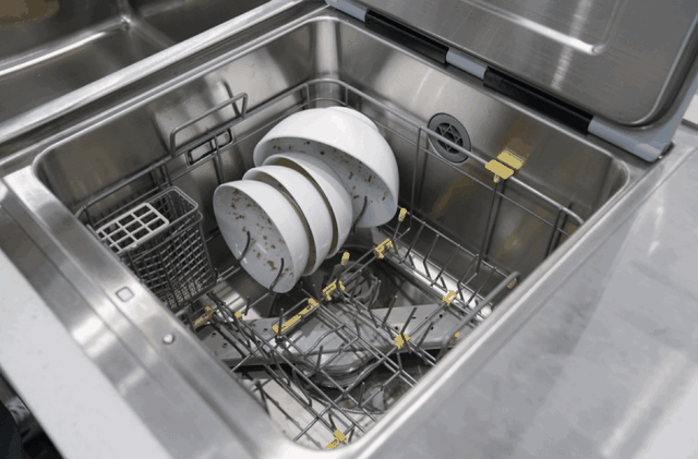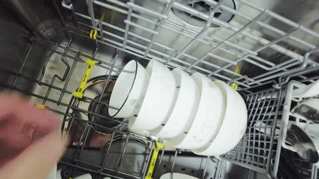 关于碗碟的摆放,朝向是有讲究的,这也是为了让水流大力冲击碗盘脏污的一面,上面动图展示的就是正确的操作 ▲