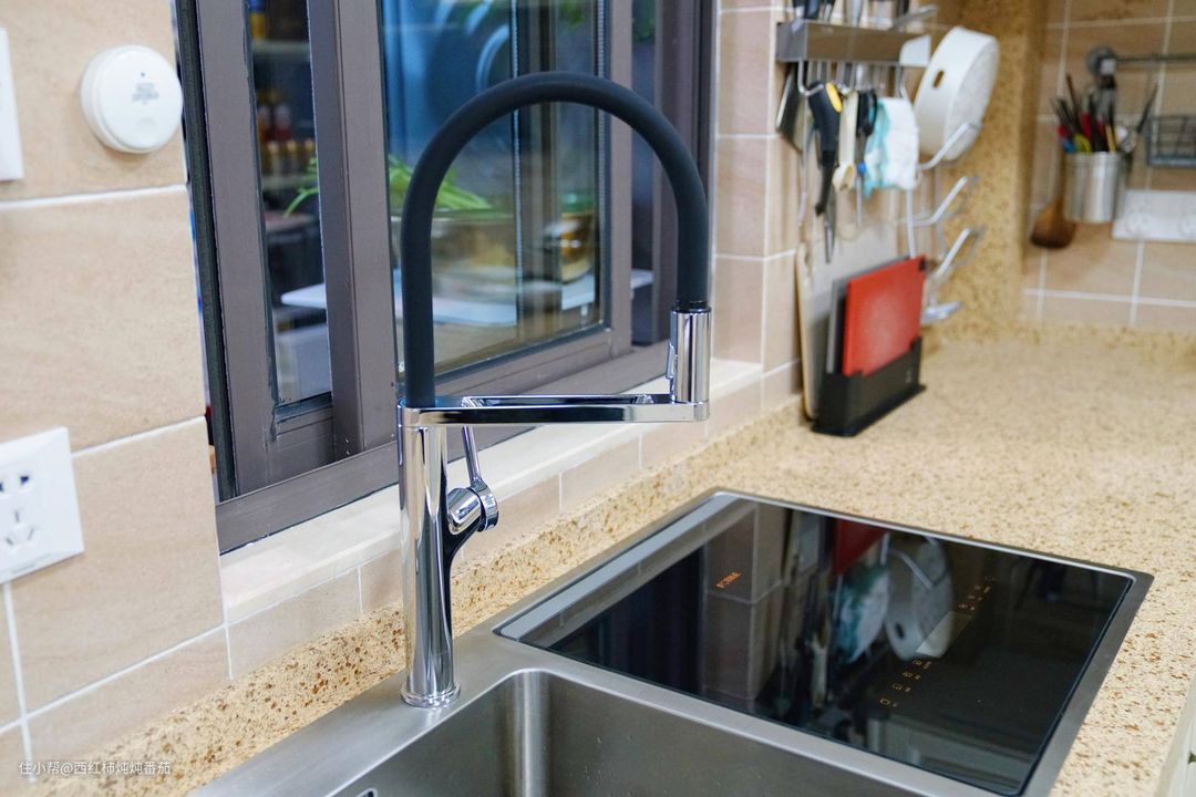水龙头颜值和功能都没问题,但毕竟不支持抽拉,在厨房用起来不够酣畅淋漓。 所以楼主后面又自己动手换了一款抽拉龙头 ▼