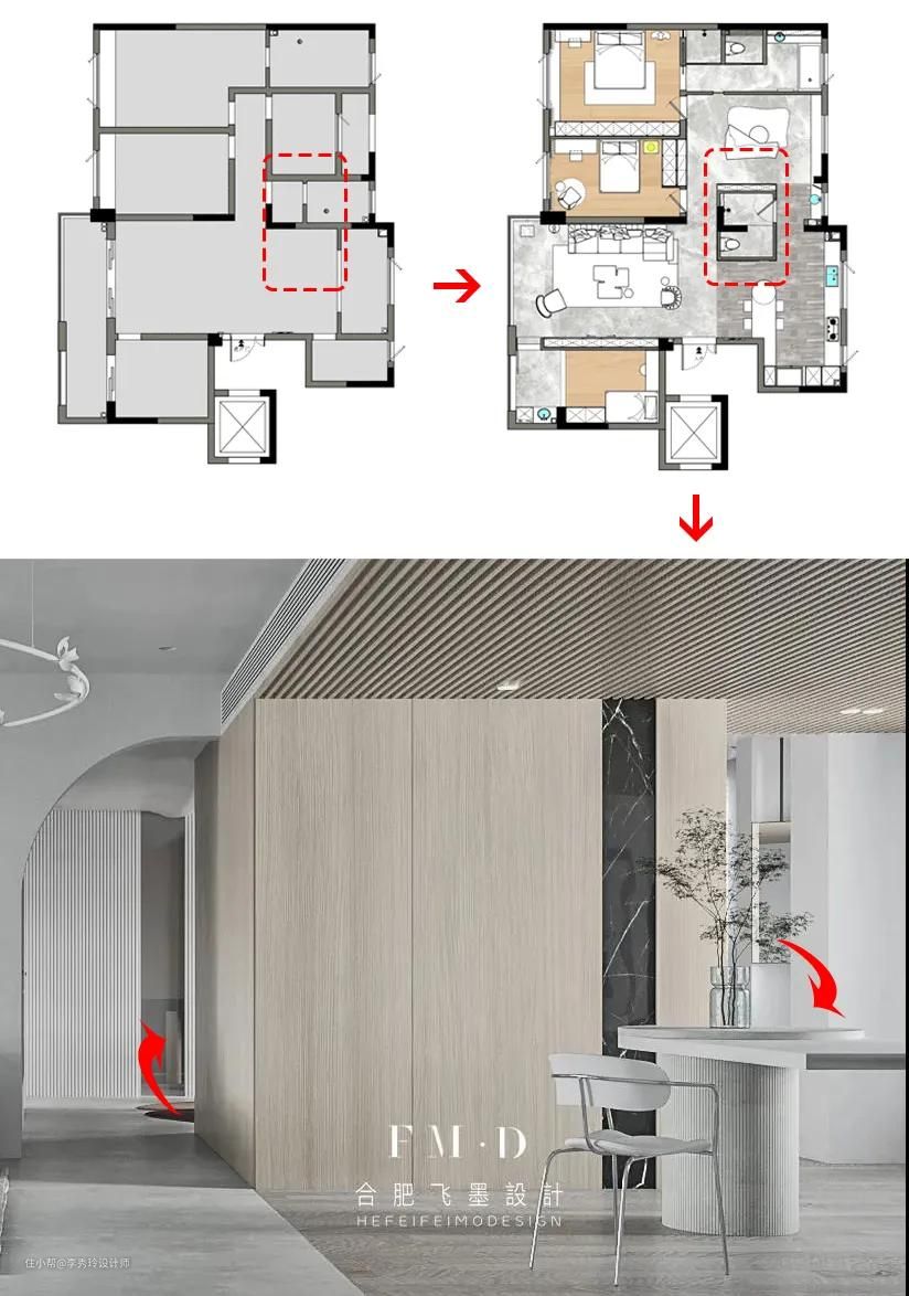 1、减少空间中的实墙隔断。比如,将多个碎小的空间整合成一个: