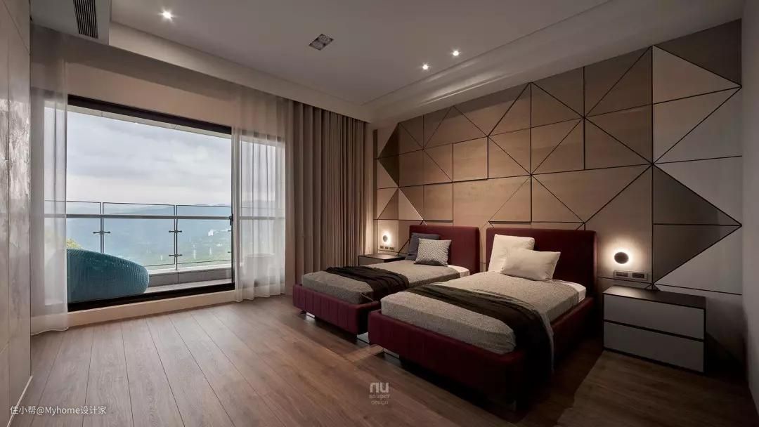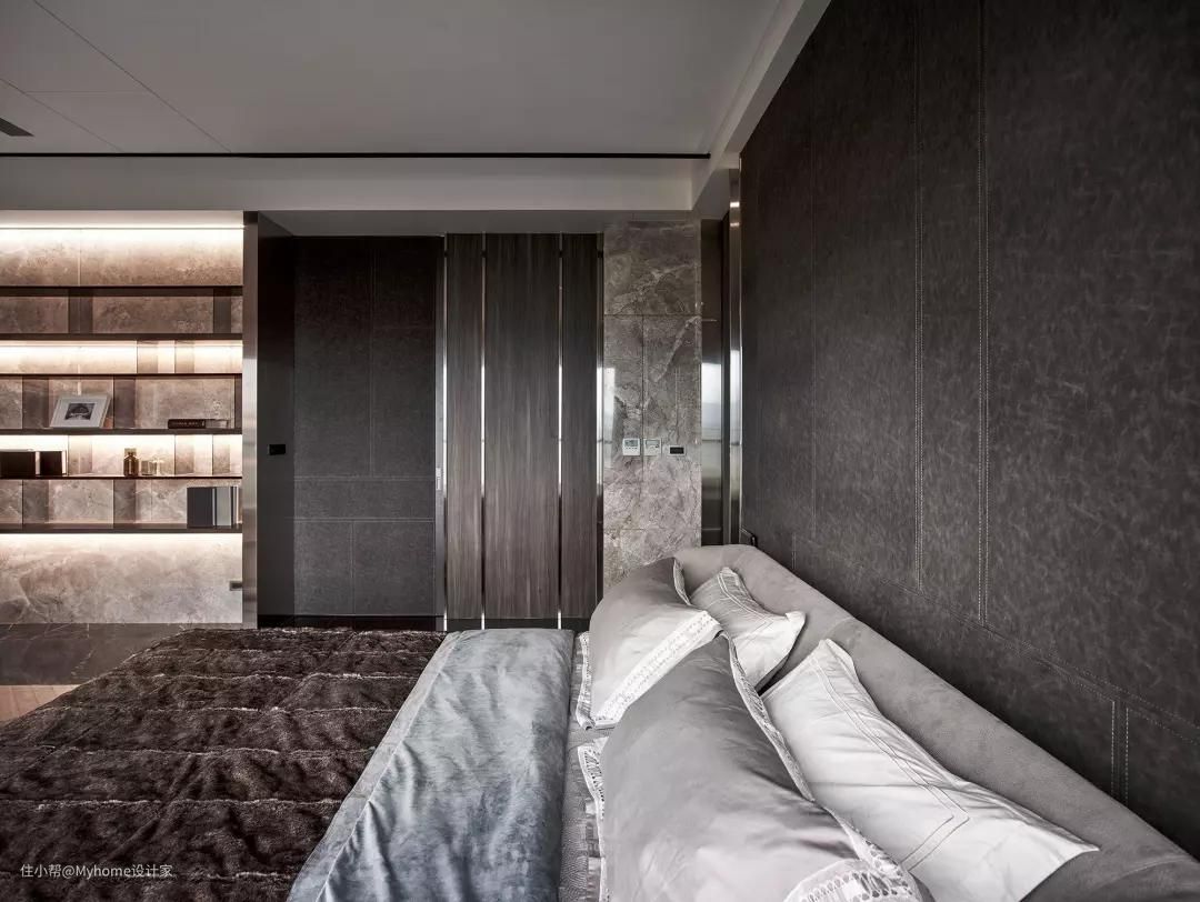 主卧室的床头背板使用了与跑车内装同等级的皮革,