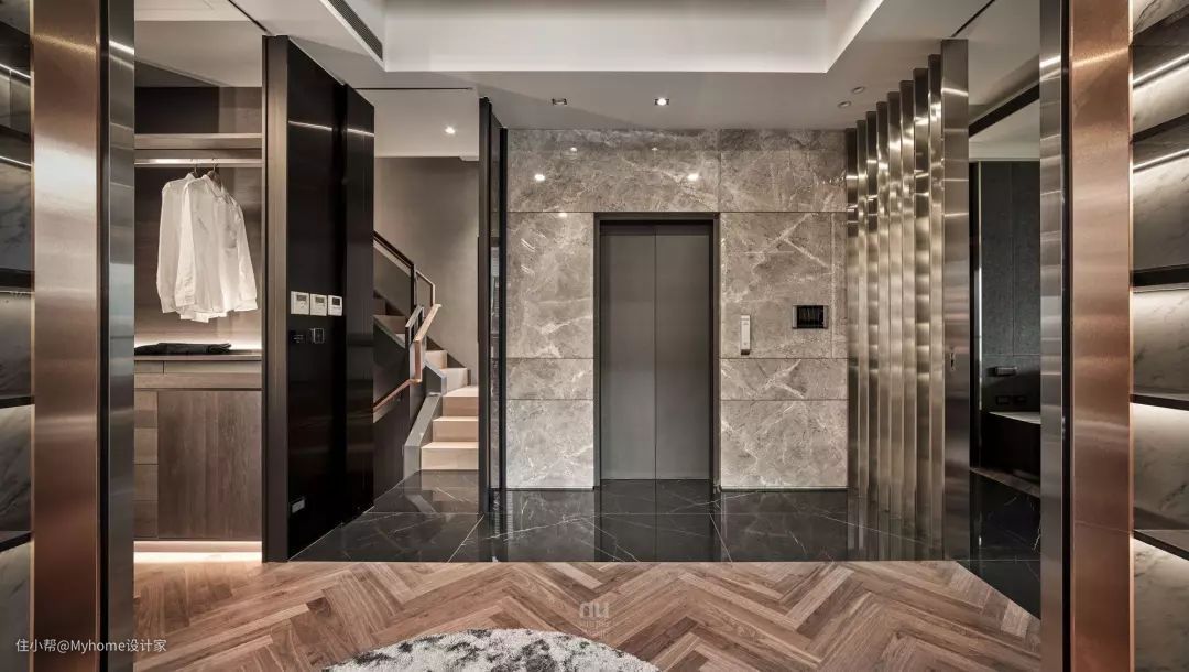 男女主人的更衣室分别规划在电梯两侧,女主人的更衣室位于进入卫生间前,