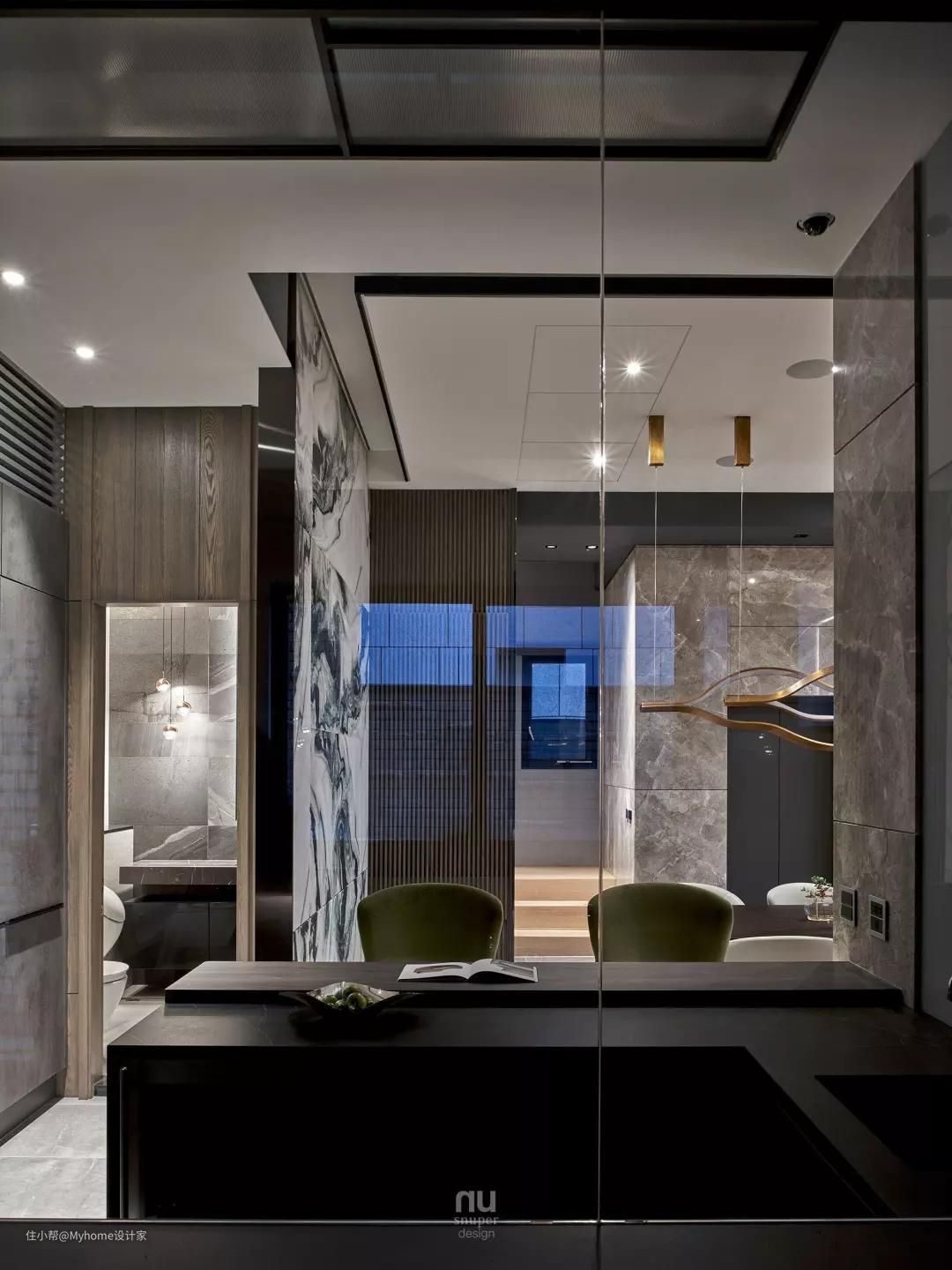 借此更提升了整个空间的纵深,而这块精选的“云山水”大理石,