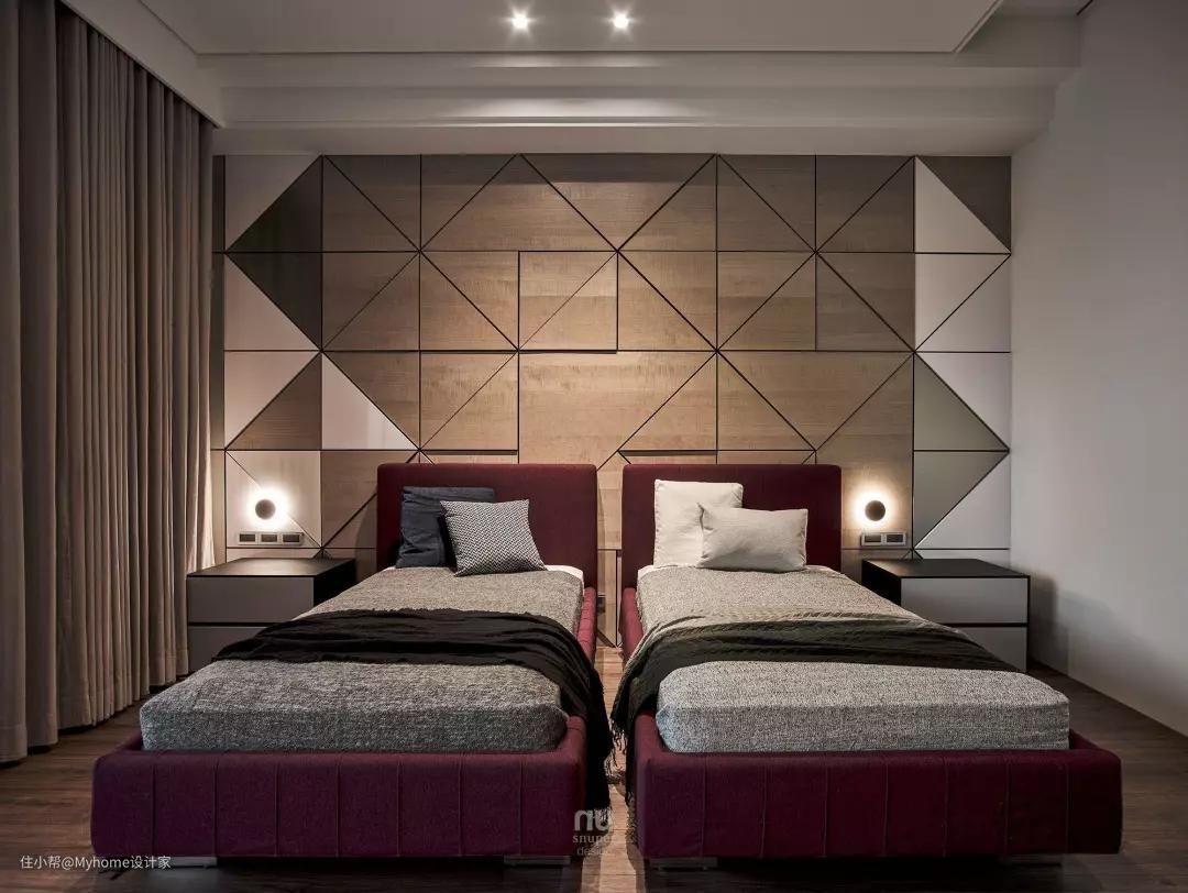 床头背板使用了木皮、钢琴烤漆、不锈钢等材质,
