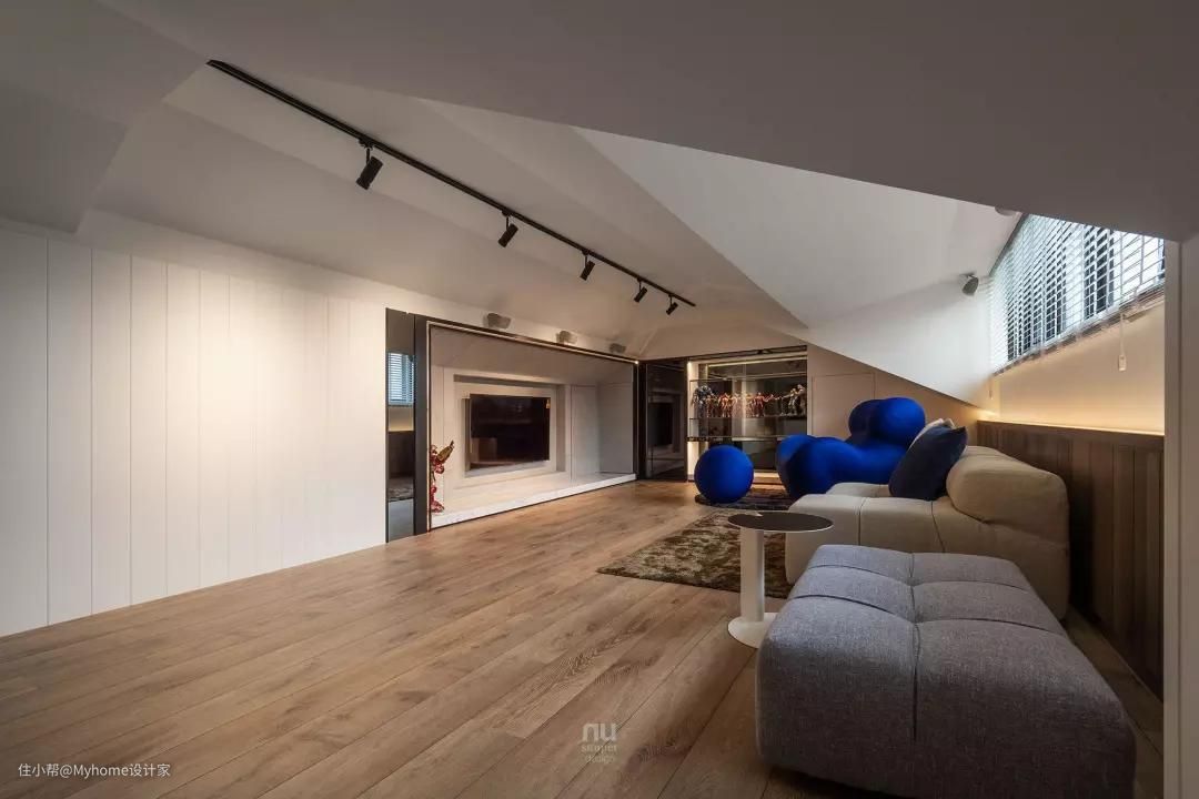 阁楼是男屋主独享的小天地,在建筑物既有的斜屋顶架构下,