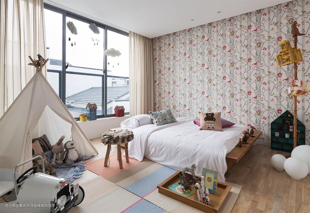 彩色的沙滩挂画,嬉戏的小猫图案,还有四仰八叉的粉红豹,小小的鹿角凳……搭配丰富的色彩,显得亮丽活泼生动。整体空间看上去十分的和谐自然,呈现家温馨与幸福的模样。