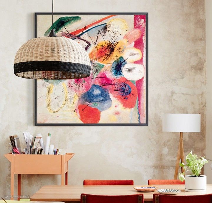 当家中的色彩相对单调沉闷的时候,可以选择一幅色彩浓烈的画作,可以起到画龙点睛的作用;相反,如果家中色彩比较明丽,就可以选择相对简单的配色起到抑制作用,不会显得过于浮夸。
