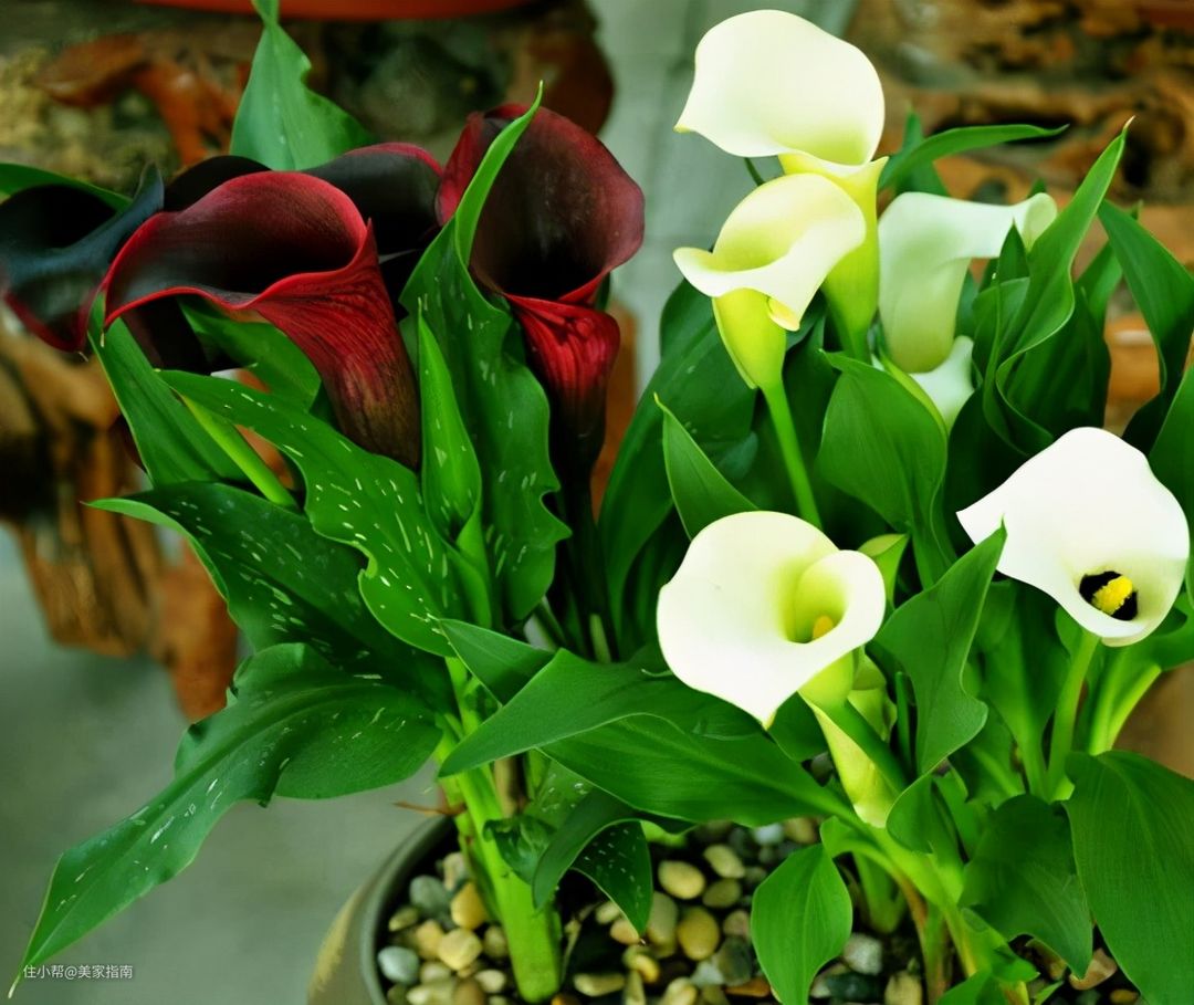 除了水培的种球花,冬季开花的还有需要土养的马蹄莲。马蹄莲的花朵形似马蹄,花色多样,进口品种的颜色更是丰富多彩;它的叶片相对宽大,叶面之上常点缀白色斑点,让花茎还没有抽出时的植株,也颇具看点。马蹄莲的养护相比之下可能要麻烦一些。它温暖、湿润和阳光充足的环境,虽说夏季休眠冬季开花,但没有暖气的北方养护起来难度可是不小,首先温度就不达标,养之前一定要想好。如果说水仙是清雅的,那马蹄莲应该是具有热带风情的花卉,这样的花卉摆在家里,能带来不少的清新气息。
