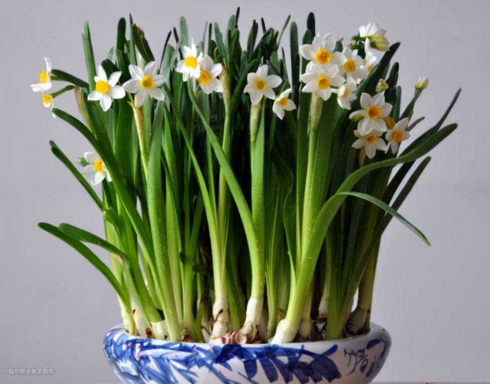 风信子花色多,花味重,算是热热闹闹的花卉,水仙虽说也是典型的种球花,开在寒冷的冬季,相比之下确实清雅高洁的,这体现在两个方面。水仙的花色清雅,白色花瓣红色蕊心,衬在葱葱郁郁的绿色叶片中,颜色的搭配本身就格外具有雅致的感觉。其次,水仙味道轻,不似风信子浓重。另外,它两者虽都能水养,但养护方式上稍有不同。水仙水培不需要大水,反而过于深的水量会影响花枝的抽出,枝叶也会徒长。最佳的处理方式是,夜晚减少水量,可倒出一部分,放在温度相对低一些的地方,白天添加水分,放回温暖有光照的阳台即可。