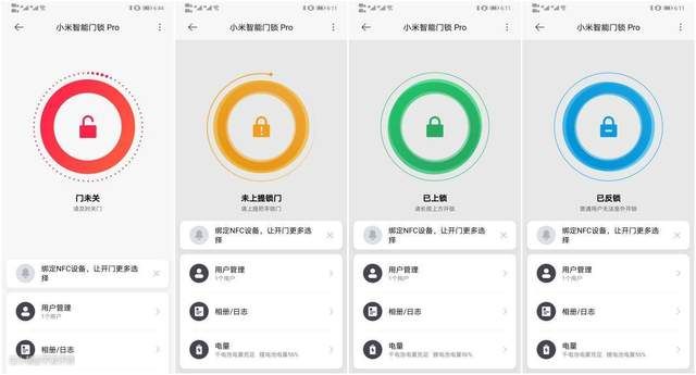 在米家APP中,小米智能门锁Pro会显示四种状态:门未关-红色、未上提锁门-黄色、已上锁-绿色和已反锁-蓝色。