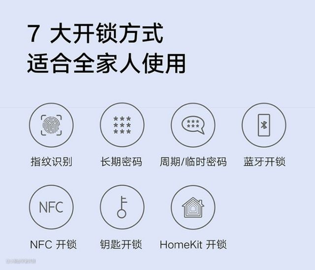 - 支持七种开锁方式,符合不同年龄段的用户群体(比如老人孩子)的需求。同时针对老用户,功能与性能方面有更多的提升,苹果homekit也让联动场景更加丰富;