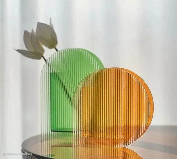 颜值极高的长虹玻璃也经常直接被拿来作为装饰品,作为玻璃材质的样式升级,不管用来作为容器还是饰品,效果都非常好;直接用彩色的长虹玻璃切割成简单的造型,本身就是一幅艺术品。