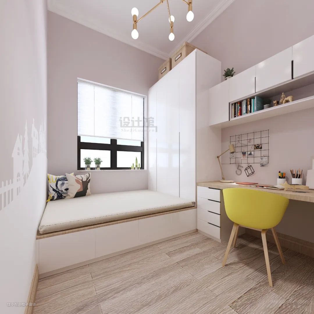 有些家庭原本是有预留书房(或茶室)的,当二胎来临之后,为了给小宝宝腾个私人空间,就要牺牲一下主人的书房空间,把书房空间改造成儿童房了,改造的时候可以保留书桌,做成榻榻米床+衣柜+书桌的组合设计。这样偶尔主人需要用到书房的时候也还可以用上,同时等小宝宝长大了要写作业也有个合适的位置。