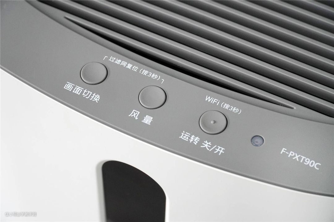 松下F-93C0PX空气净化器的顶部是出风口和按键操作区,出风口没什么可聊的。在这里主要说说按键操作区,整台空气净化器一共只有三个按键,分别是画面切换键、风量调整键和开关键,操作起来非常简单。当你同时长按风量键和画面切换键的时候,就会自动打开童锁,避免小朋友误操作。而如果长按开关键,就可以将净化器连接入无线网络之中,进行远程操作。