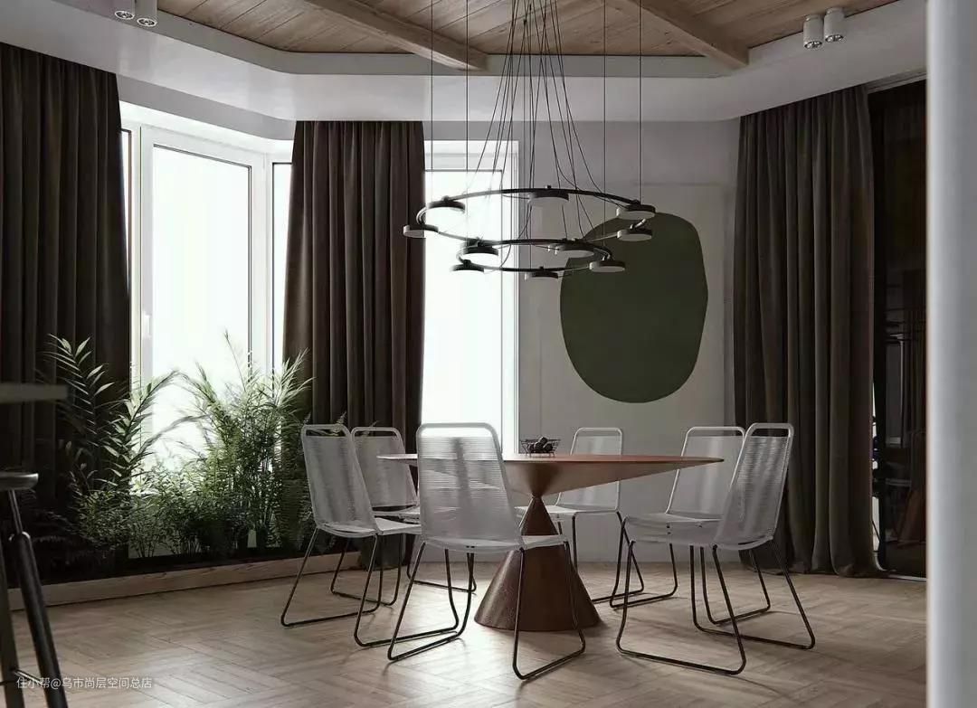 餐厅的光源重点,一般放在餐桌上方及餐边柜,餐桌灯可以选择吊灯,距离桌面 65cm~70cm 比较合适。