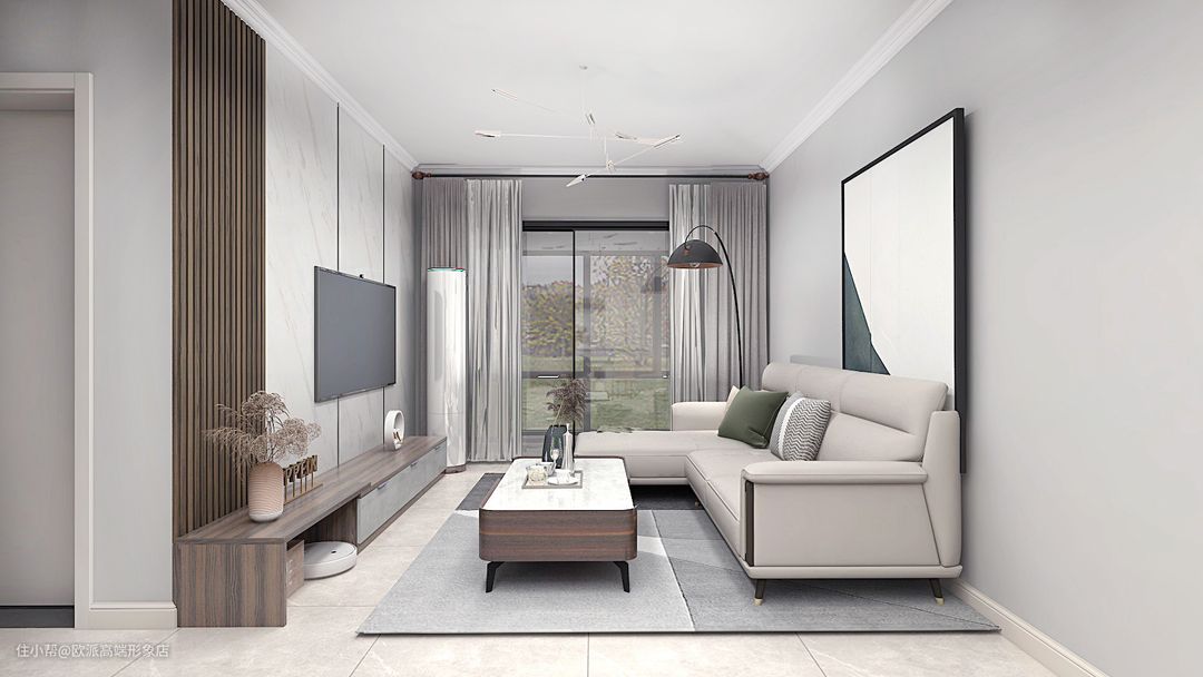 米白色布艺沙发和温润的胡桃木茶几是绝配,营造出温馨舒适的氛围。细腿设计可让扫地机器人畅通无阻,也可以显得整个空间更轻盈,对小户型非常友好。
