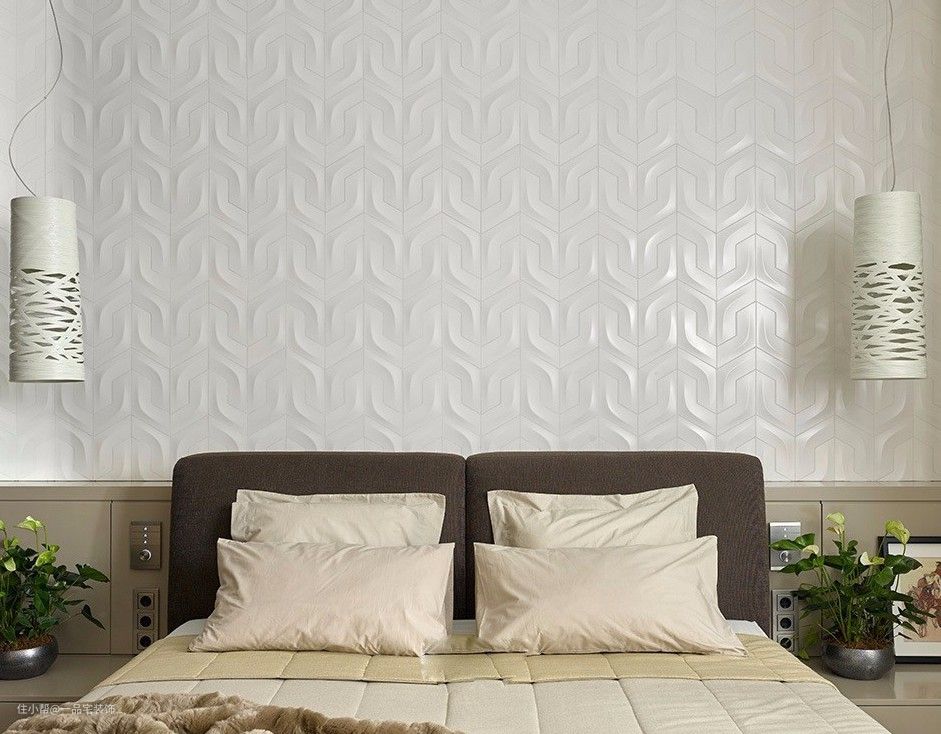 主卧用了简单的回字形灯池和一条石膏线,漂亮的水晶吊灯周围是一圈圆形的石膏线,显得简约时尚,墙面使用素色的壁纸,使空间看起来优雅简单