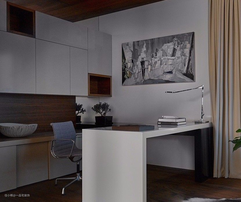业主信奉佛教,所以书房一面墙采用的书柜跟佛龛一体化的设计理念