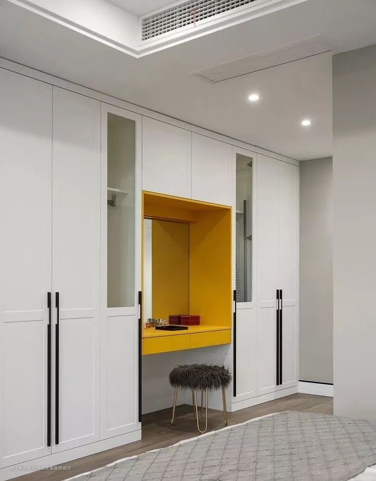 衣柜与梳妆柜组合设计,可以轻松搞定化妆+化妆,在设计的时候可以直将衣柜延展出一个梳妆台;也可以在衣柜里留一块儿地方。