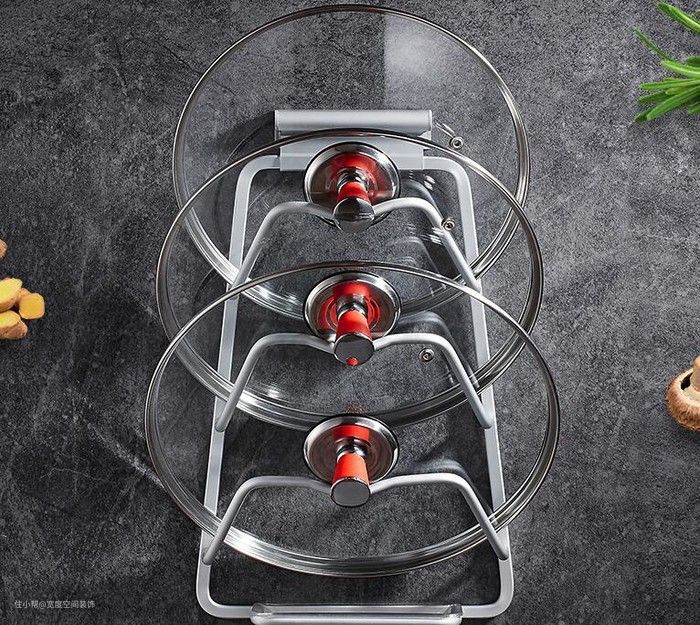 厨房里是有不少的锅具的,有炒锅、炖锅、汤锅等等,在做饭的时候,有时候锅盖是不需要使用的,直接摆放在台面上就会非常占空间,要是一个不注意更容易碰掉锅盖而摔碎。为了更好的放置锅盖,在厨房里放置一个锅盖架是个不错的注意。