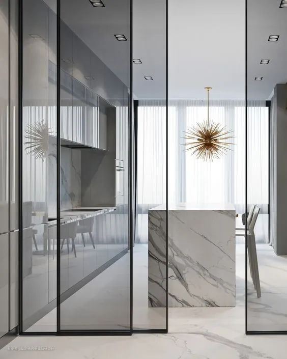 根据不同的功能空间和装修风格,可以选择不同的玻璃材质,透明、半透明以及磨砂等材质都会为家居空间带来不一样的格调氛围。