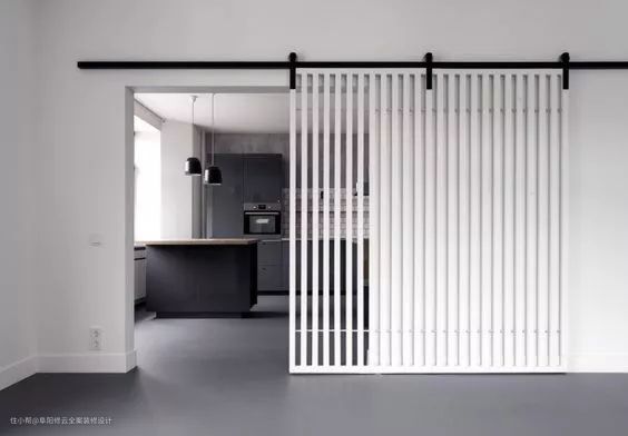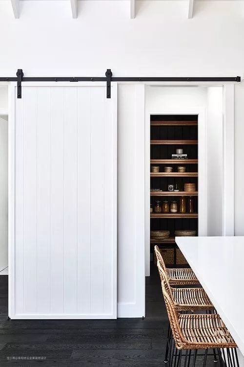 由于谷仓门是吊轨门,在安装的时候要和墙面留出1cm以上的缝隙,所以适合非密闭性,或对隔音性、安全性要求不那么高的场所,比如说厨房、储藏室、洗衣房、衣帽间等空间。