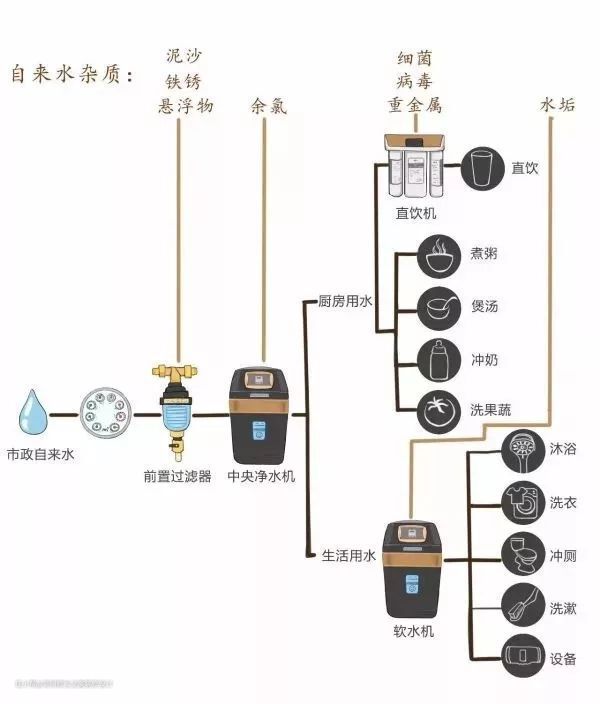 别不信,很多业主眼中理解的全屋净水就是这三样,并不知道中央净水和中央软水的存在,这时我们有必要普及这方面的知识。
