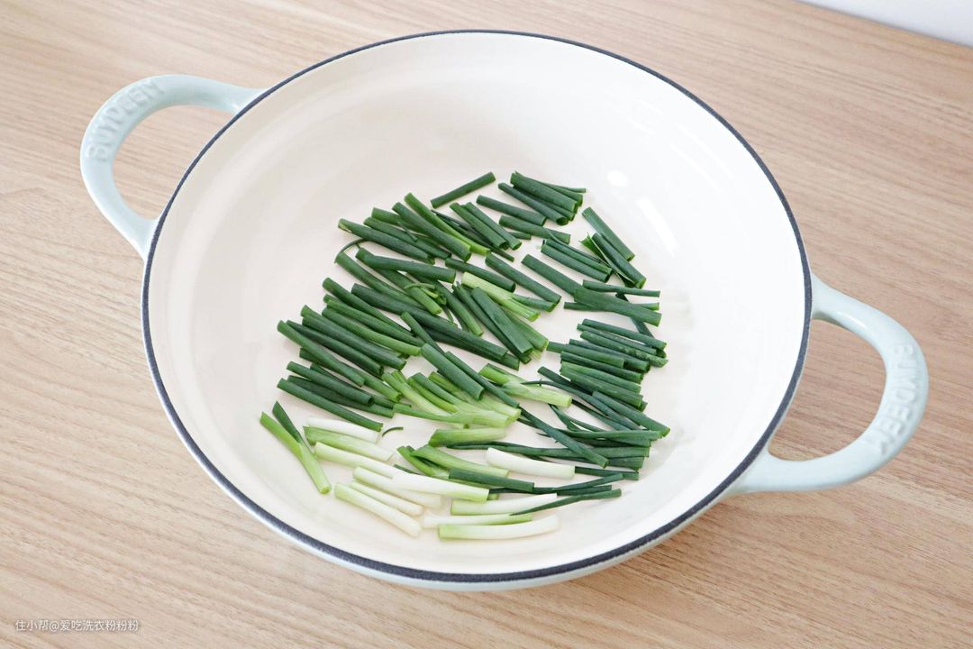 ▼锅底铺葱去去腥,顺便留一点葱叶切成细丝泡水,就会变成卷曲的形状非常好看。