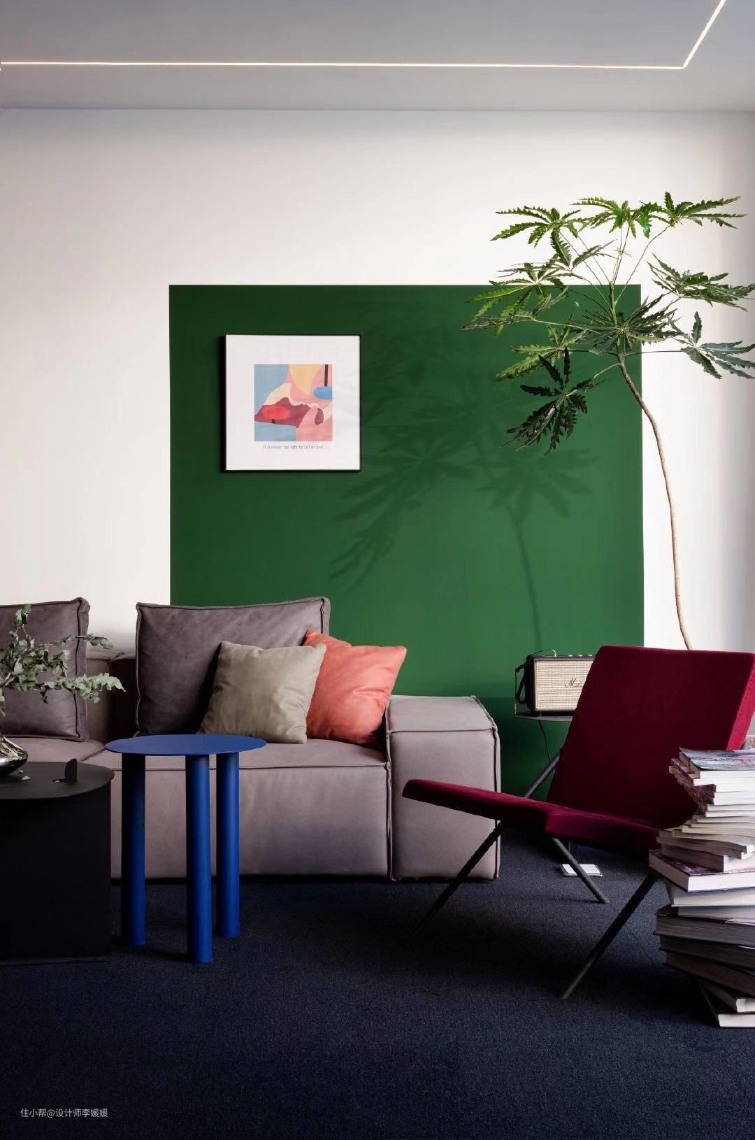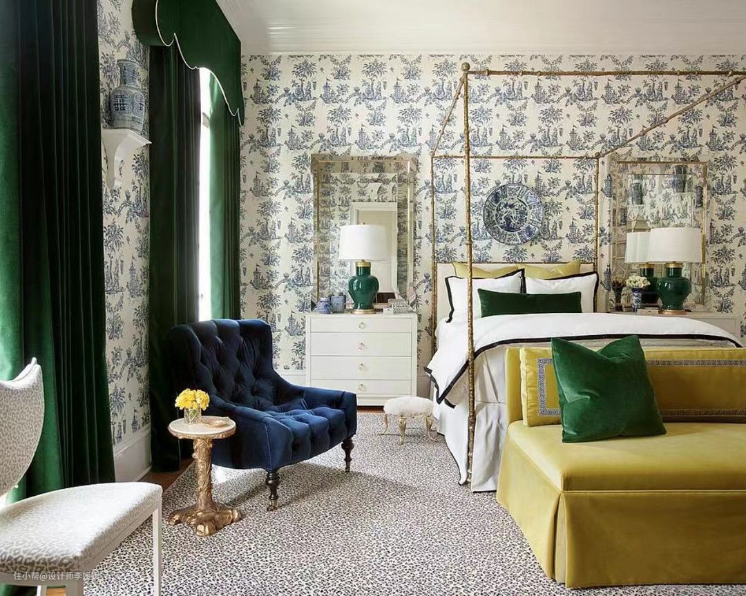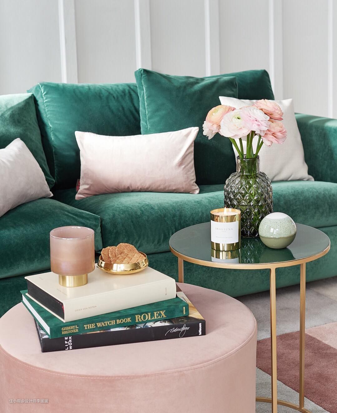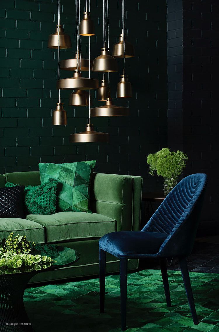 🌲浅色背景空间搭配墨绿与蓝色的家具软装饰品,整体空间典雅高级