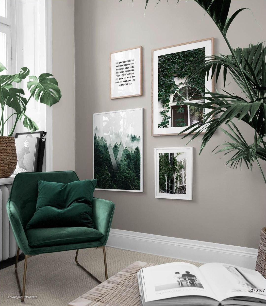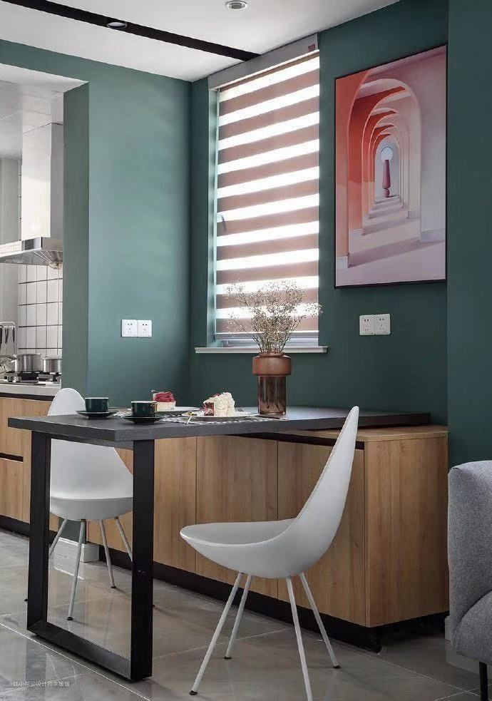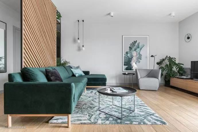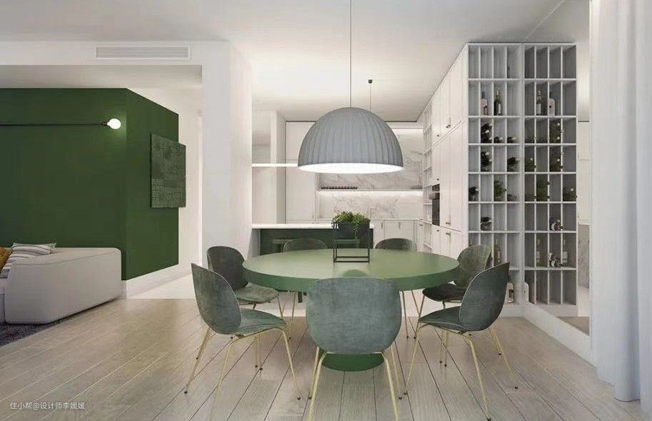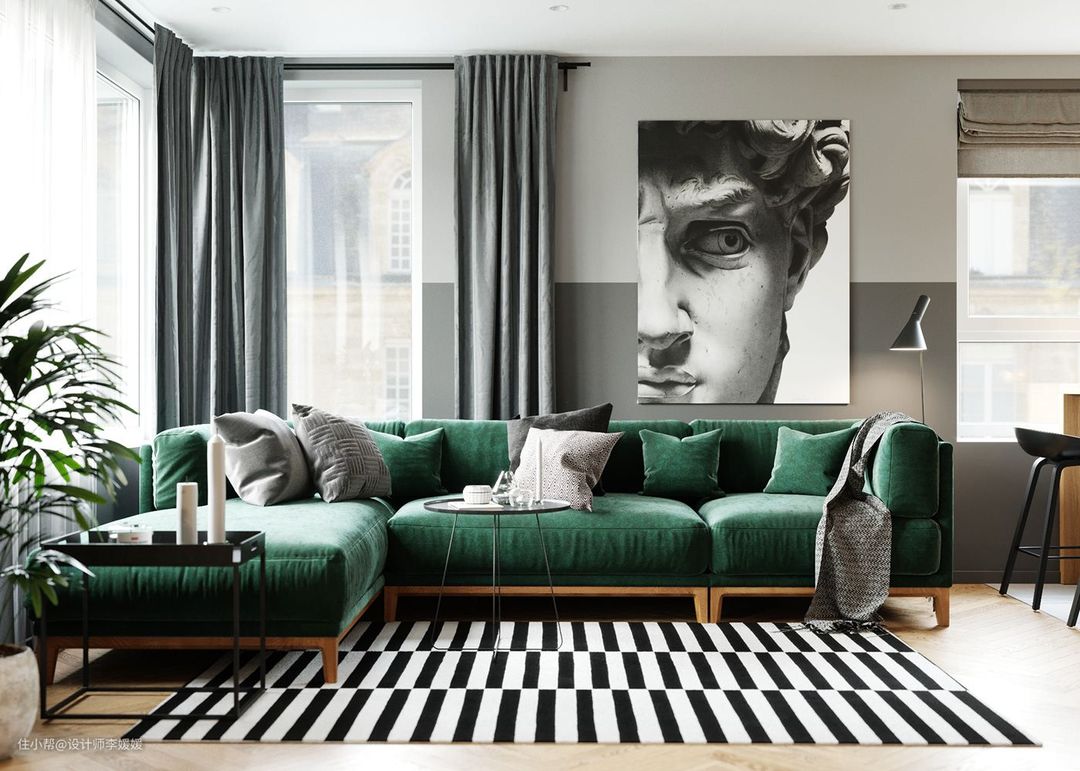 墨绿色是相对比较暗淡的颜色,而黑白灰能很好地中和协调它。当它与黑白灰搭配时时尚气息十足,都市精英范立显。尤其在公寓设计中运用较多。