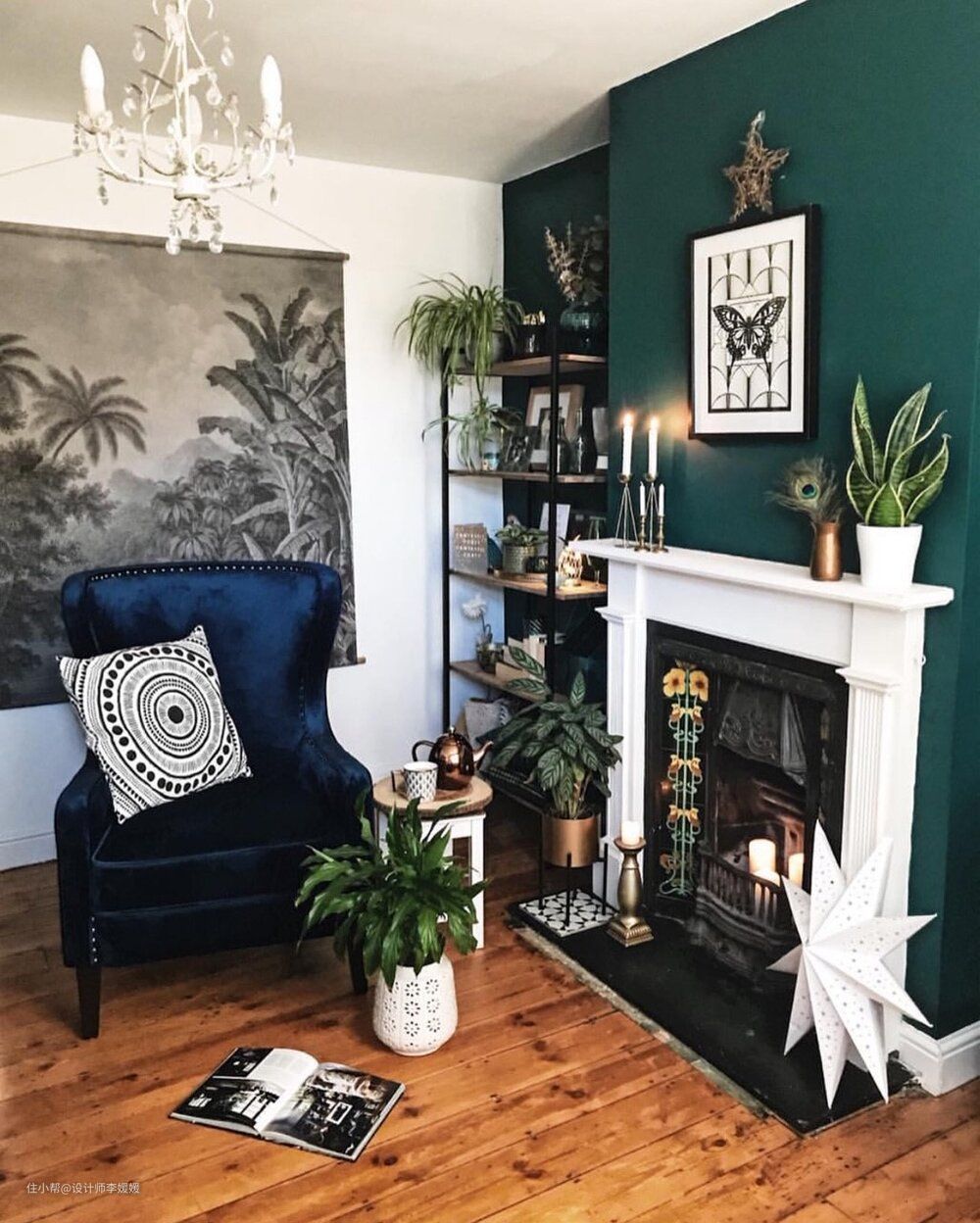 🌲以墨绿色或深蓝色为背景搭配墨绿或蓝色家具软装饰品,古典浓郁的历史怀旧感,每一个角落都藏着历久弥新将要娓娓道来的故事。