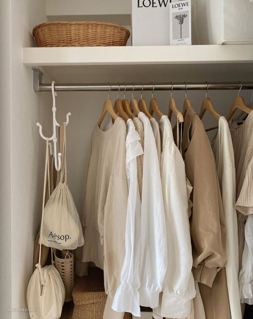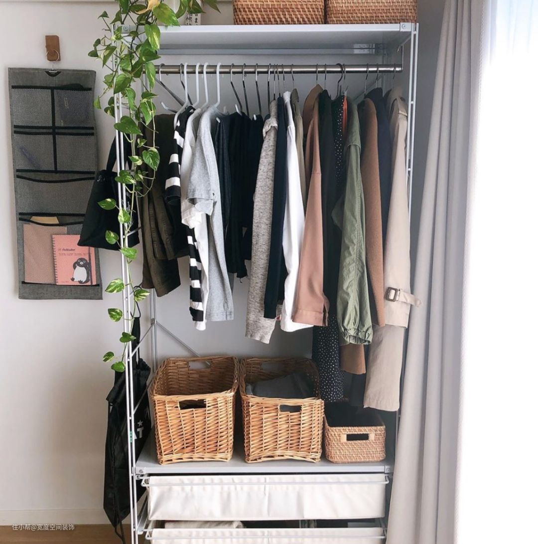 多功能用途钢架也可以,再搭配藤编收纳盒来收纳小件衣物,比如小吊带、各种袜子等,进而也避免了凌乱。