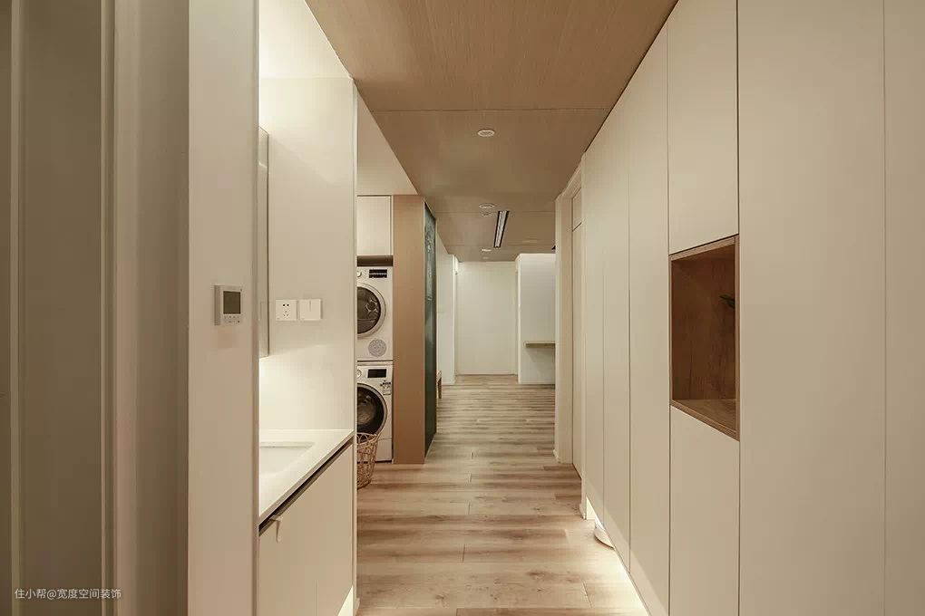 还可以利用户型来开辟通勤衣物区。设计师文骏利用原门洞设计了一个壁龛式储物柜,上面挂外套、中间的小壁龛能放钥匙,底部作换鞋凳、抽屉内收纳拖鞋。并且凹进去的收纳空间,看让玄关看起来会更整洁。
